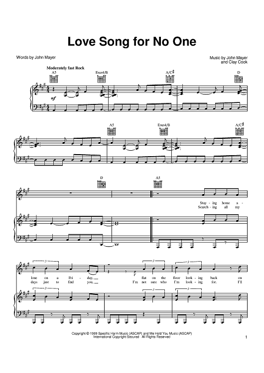 Digital Sheet Music for Love Song For No One by Clay Cook, John Mayer scored for Piano/Vocal/Chords; id:371462