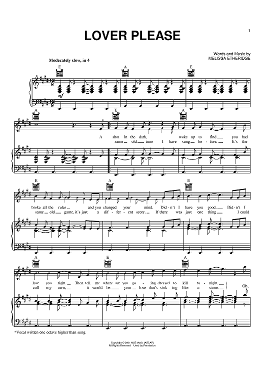 Digital Sheet Music for Lover Please by Melissa Etheridge scored for Piano/Vocal/Chords; id:386044