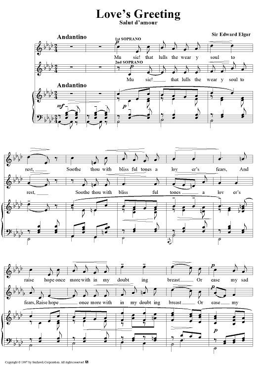 Digital Sheet Music for Love's Greeting (Salut d'amour) by Edward Elgar scored for Two Sopranos/Piano; id:94659