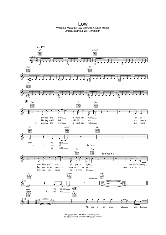 Digital Sheet Music for Low by Chris Martin, Coldplay, Jonny Buckland, Guy Berryman scored for Lead Sheet; id:389257