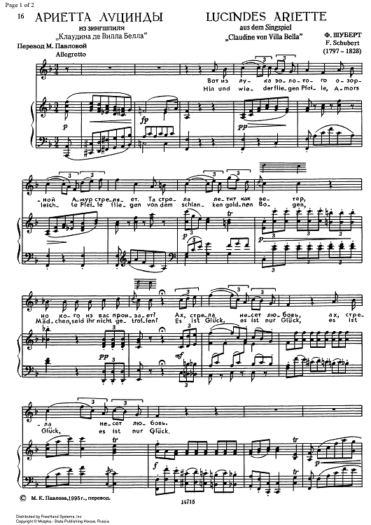 Digital Sheet Music for Lucindes Ariette from Claudine von Villa Bella D239 by Franz Schubert scored for Soprano/Piano; id:337172
