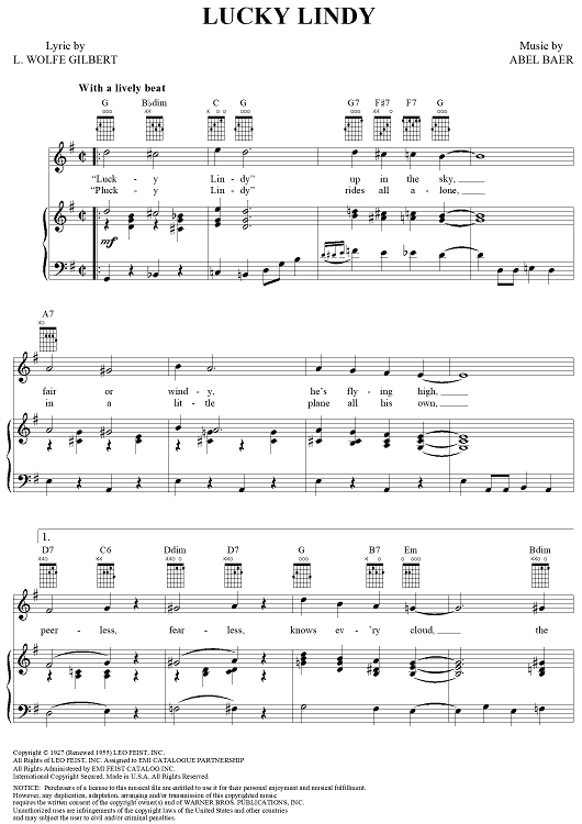 Digital Sheet Music for Lucky Lindy by L. Wolfe Gilbert, Abel Baer scored for Piano/Vocal/Chords; id:276291