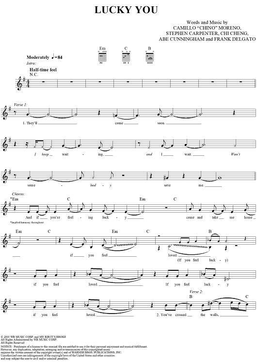Digital Sheet Music for Lucky You by Deftones, Chino Moreno, Chi Cheng, Abe Cunningham, Frank Delgato scored for Guitar Tab/Vocal; id:303038