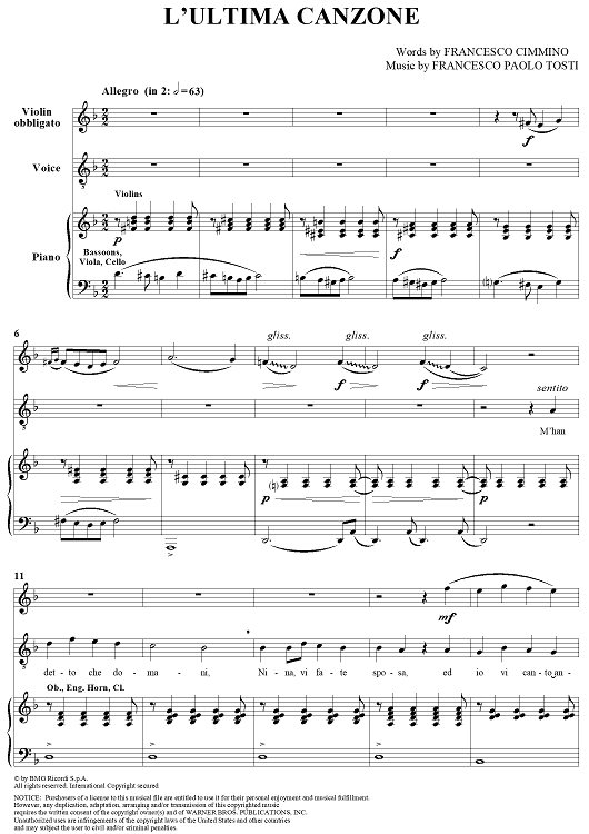 Digital Sheet Music for L'Ultima Canzone by Andrea Bocelli, Francesco Cimmino, Francesco Paolo Tosti scored for Piano/Vocal/Violin; id:296218