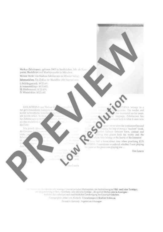 "Markus Zahnhausen’s Lux Aeterna belongs to a very special category in my repertoire. The tender and dangerous beauty of his music has fascinated me for years. In a contemporary musical language Zahnhausen has managed to bring the instrument back to what it once was: flauto - the flute! His expressive music never takes the instrument beyond its limits, thus avoiding the "trap" of many a "modern" work. There is a perfect balance between form, content and idiomatic writing that places both his music and the recorder where they belong: in the hearts of the listeners! I have had a tremendous time when studying Lux Aeterna. I sometimes wondered whether I played the piece or the piece was playing me ..." Dan Laurin