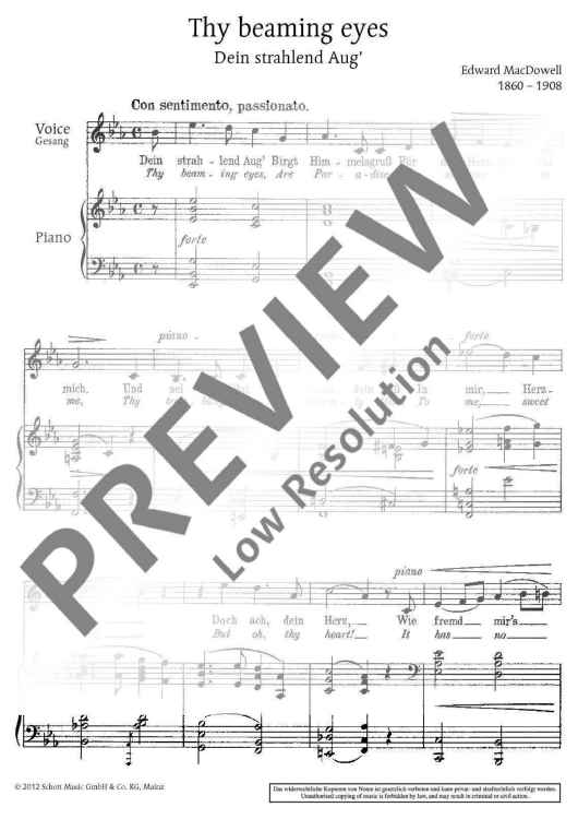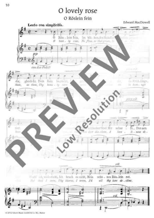 The American composer and pianist Edward MacDowell (1860 1908) is rather unknown in Europe although he had his artistic roots there for he was trained as a pianist in Paris, Stuttgart, Wiesbaden and Frankfurt. After returning to his home country, he worked as a teacher while also being the director of the Boston Symphony Orchestra for eight years. During his studies in Germany, the musician already began to compose songs (with German texts), still in the European tradition. From 1886 he used English lyricism as a basis and preferred a sparing, yet expressive accompaniment of the piano. In his last songs, he placed special emphasis on the declamatory aspect of the text and expanded the harmonic range of his tonal language. Of his 42 solo songs, the present volume contains six titles from three of his song collections: Composed or printed for the first time between 1890 and 1898, these songs are a representative selection from MacDowell's important middle creative period and, without doubt, a valuable addition to the song repertoire.