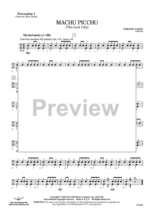 Digital Sheet Music for Machu Picchu (The Lost City) - Percussion 1 by Timothy Loest scored for Concert Band; id:447695