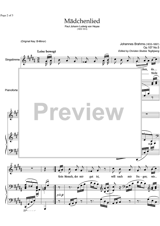Digital Sheet Music for Mädchenlied Op.107 No. 5 by , Johannes Brahms scored for Mezzo-soprano or Baritone/Piano; id:343299