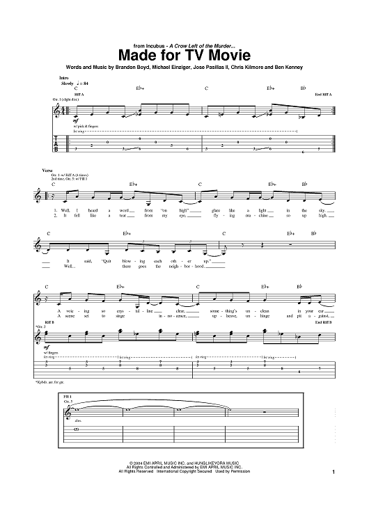 Digital Sheet Music for Made For TV Movie by Brandon Boyd, Mike Einziger, Incubus, José Antonio Pasillas II scored for Guitar Tab; id:374100