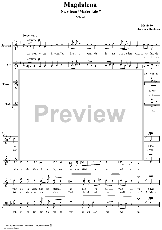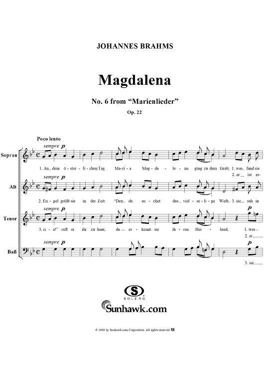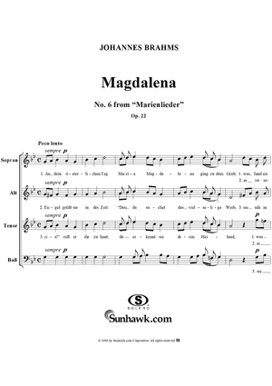 Digital Sheet Music for Magdelena - No. 6 from "Marienlieder", Op. 22 by , Johannes Brahms scored for Four-part Mixed Chorus; id:274332