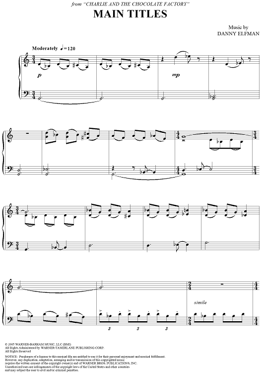 Digital Sheet Music for Main Titles from "Charlie and the Chocolate Factory" by Danny Elfman scored for Piano Solo; id:314702
