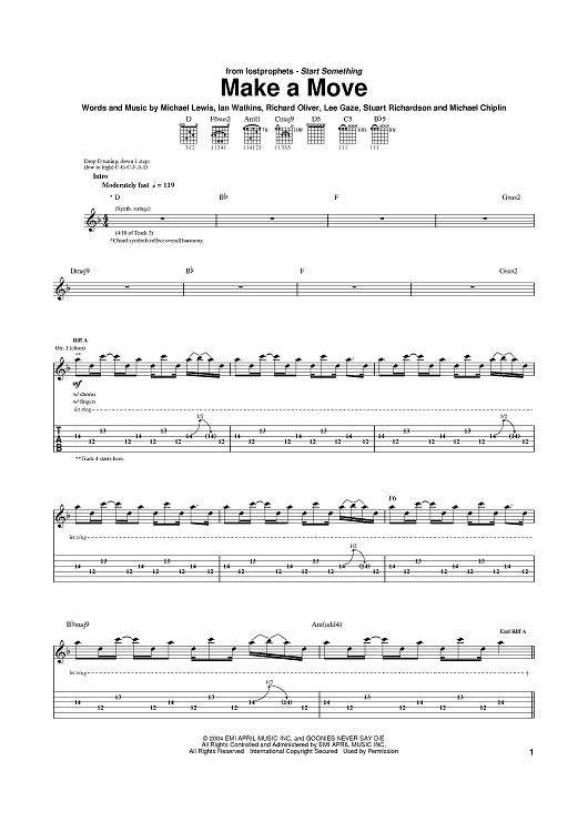 Digital Sheet Music for Make A Move by Michael Lewis, Lostprophets, Richard Oliver, Ian Watkins scored for Guitar Tab; id:374982