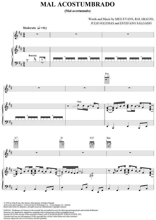 "Mal Acostumbrado (Mal Acostumado)" Sheet Music by Julio Iglesias