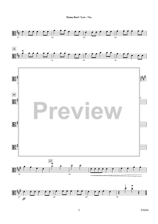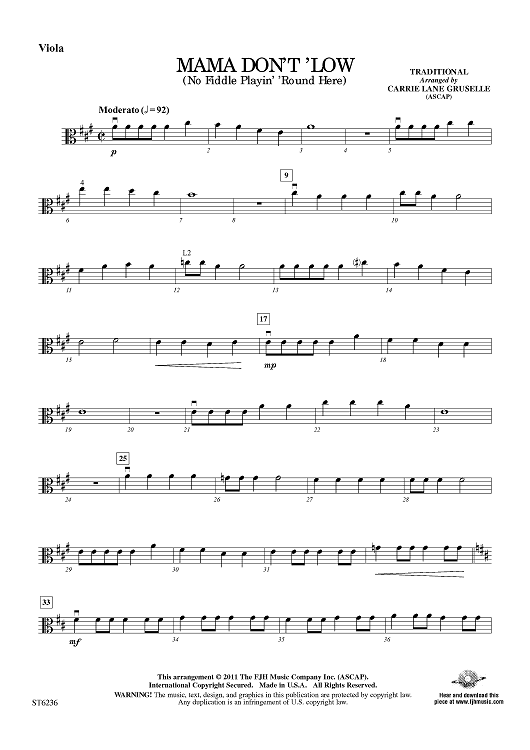 Digital Sheet Music for Mama Don’t ’Low (No Fiddle Playin’ ’Round Here) - Viola by Traditional, Carrie Lane Gruselle scored for String Orchestra; id:421681