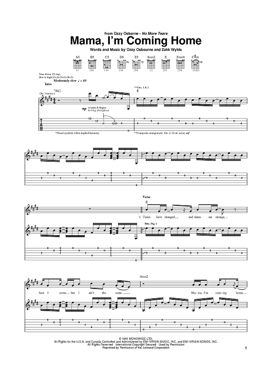 Digital Sheet Music for Mama, I'm Coming Home by Ozzy Osbourne, Zakk Wylde scored for Guitar Tab; id:369329