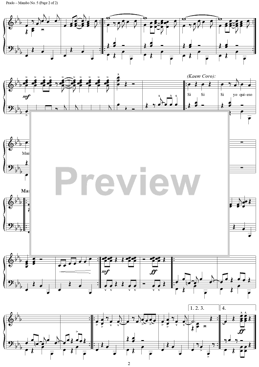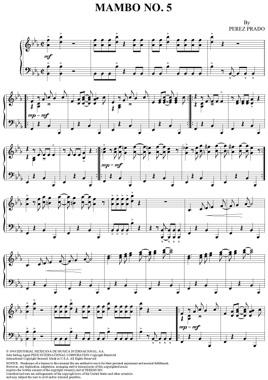 Digital Sheet Music for Mambo No. 5 by Perez Prado scored for Piano Solo; id:254816