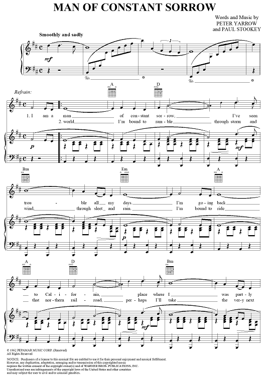 "Man of Constant Sorrow" Sheet Music by Peter, Paul and Mary