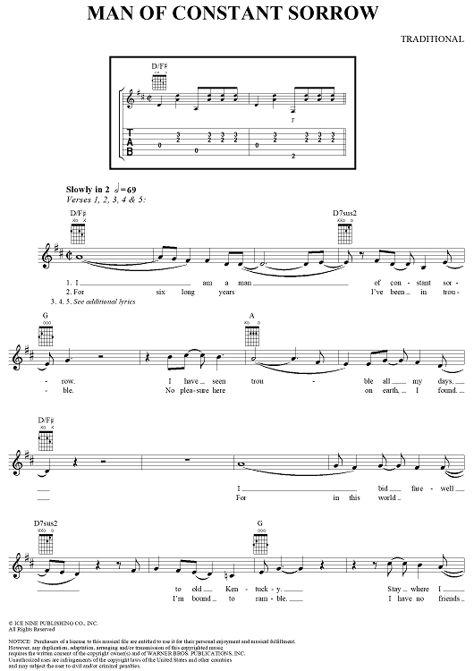 Digital Sheet Music for Man of Constant Sorrow by Jerry Garcia, Traditional scored for Easy Guitar Tab/Vocal; id:291642