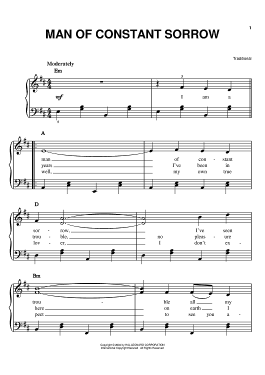 Digital Sheet Music for Man Of Constant Sorrow by scored for Easy Piano; id:373887