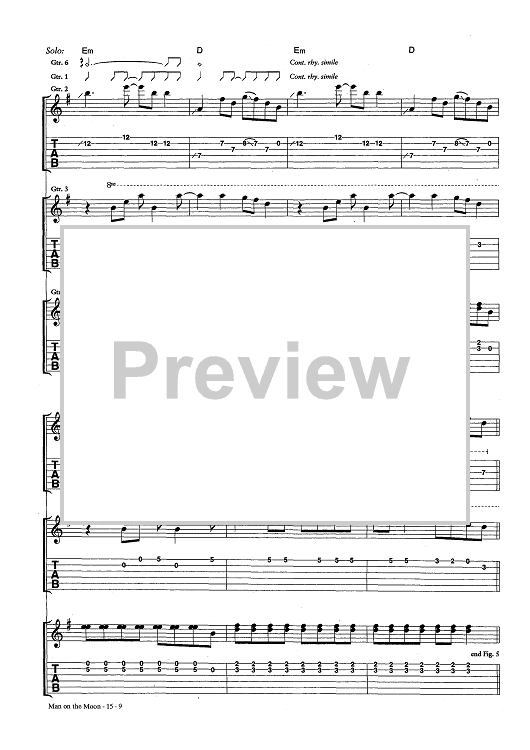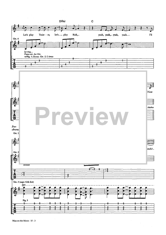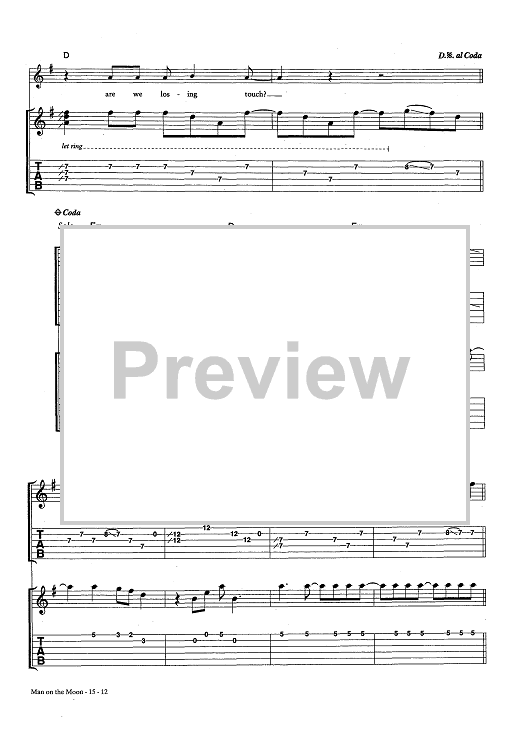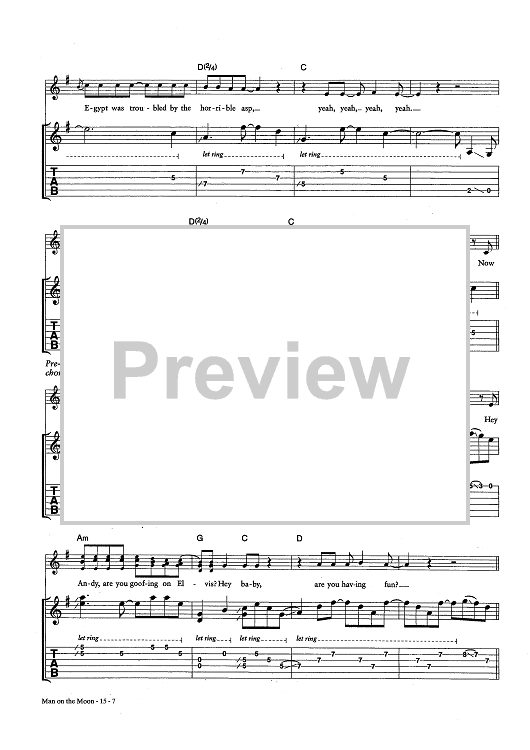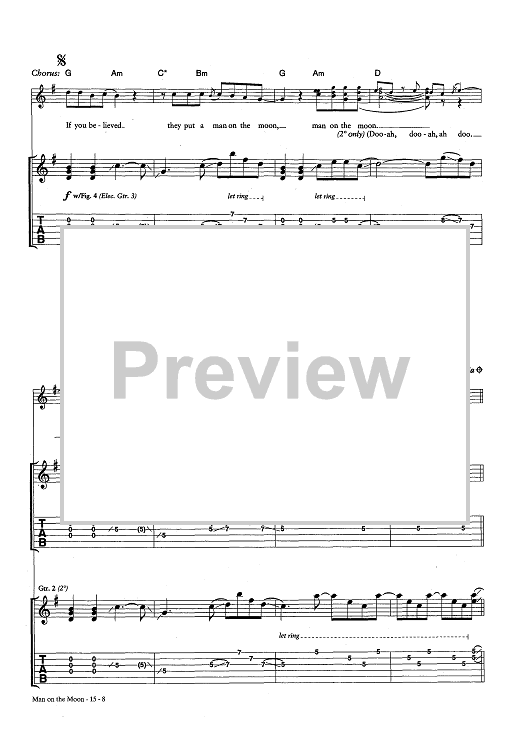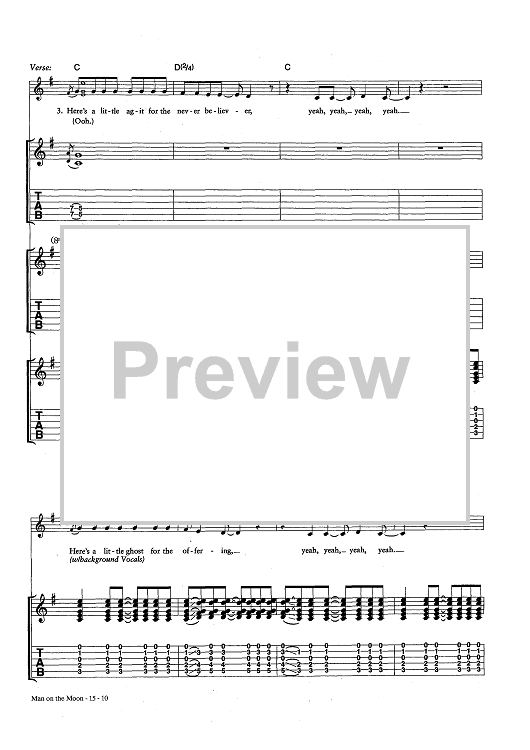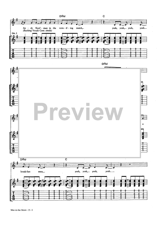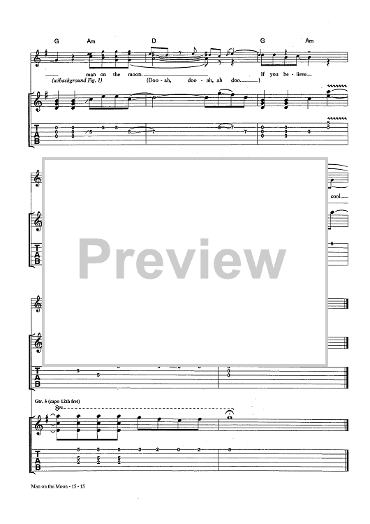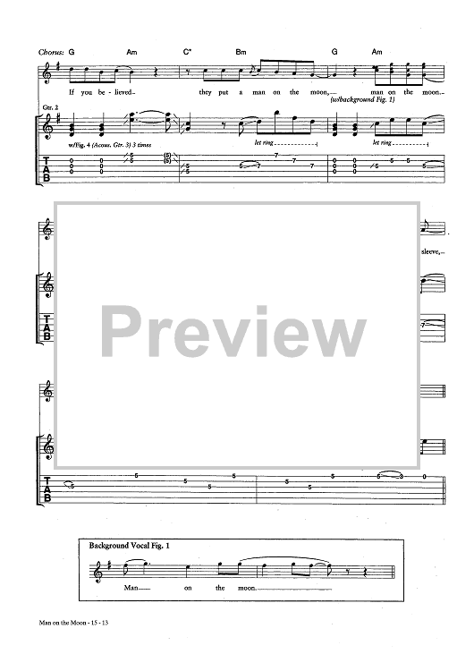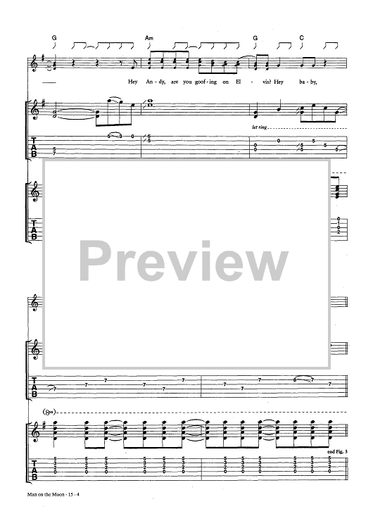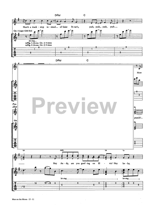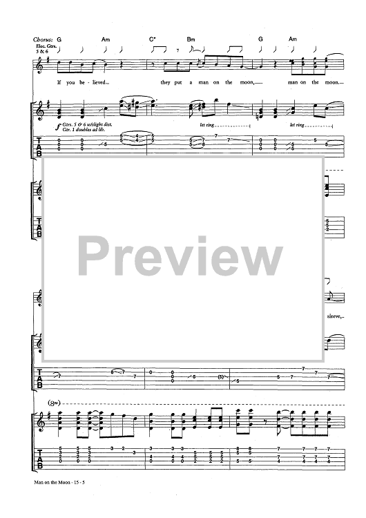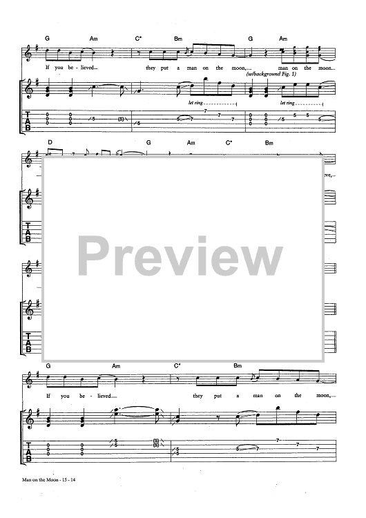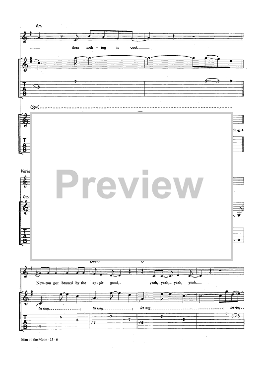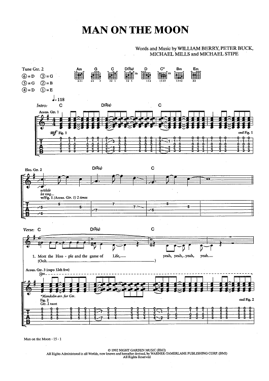 Digital Sheet Music for Man On The Moon by R.E.M., Michael Stipe, Peter Buck, Mike Mills, Bill Berry scored for Guitar Tab/Vocal/Chords; id:436630