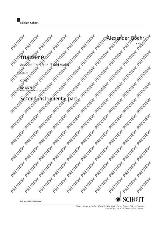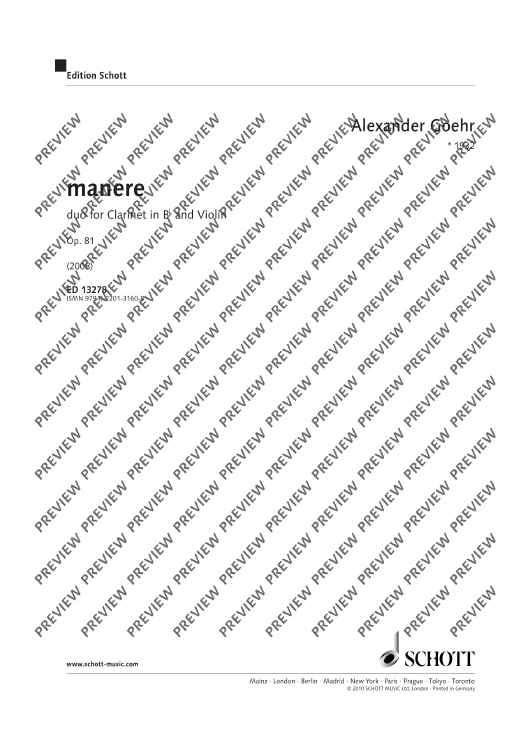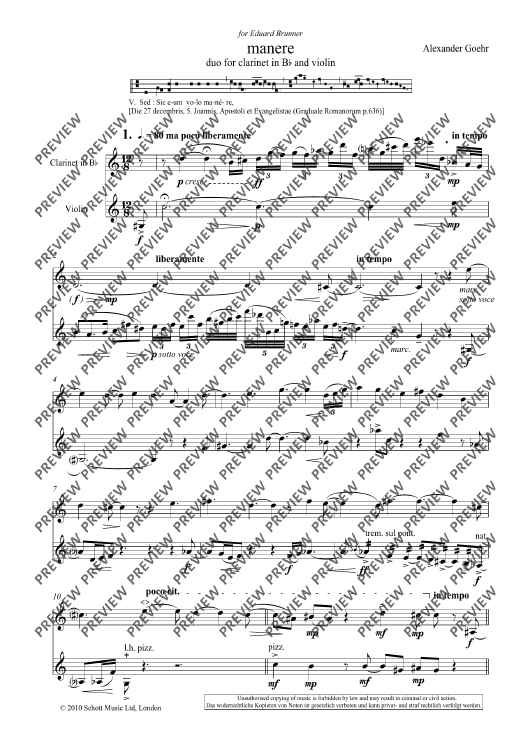 Like Goehr's quintet for clarinet and strings op. 79, manere is influenced by early music and more specifically the Gregorian chant "Sic eum volo manére" found in the Graduale Romanorum. The work itself is a 7 minute flowing dialogue between clarinet and violin characterised by a "drivenness, a felicitous racing through sections [and] a relishing of the structural advantages of unbroken flow" (Paul Driver, The Sunday Times).