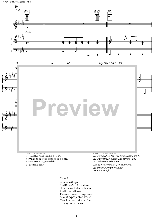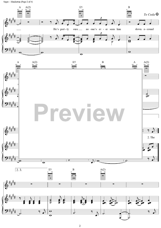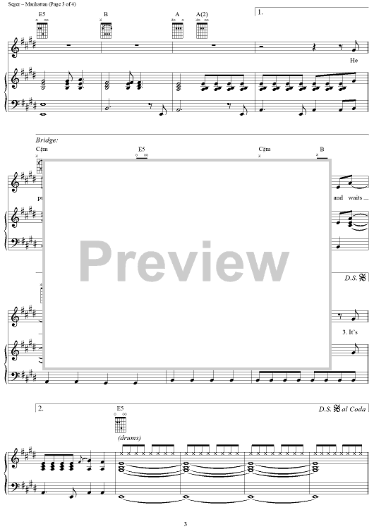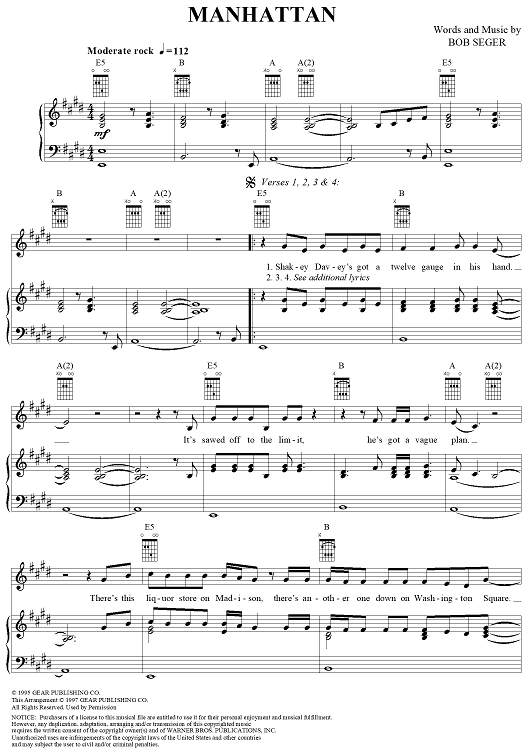 Digital Sheet Music for Manhattan by Bob Seger scored for Piano/Vocal/Chords; id:287953