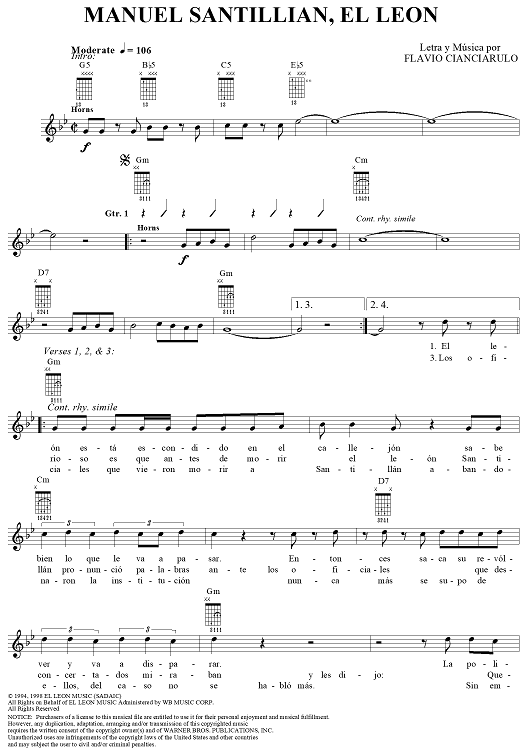 Digital Sheet Music for Manuel Santillián, El Leon by Los Fabulosos Cadillacs, Flavio Cianciarulo scored for Lead Sheet; id:135506
