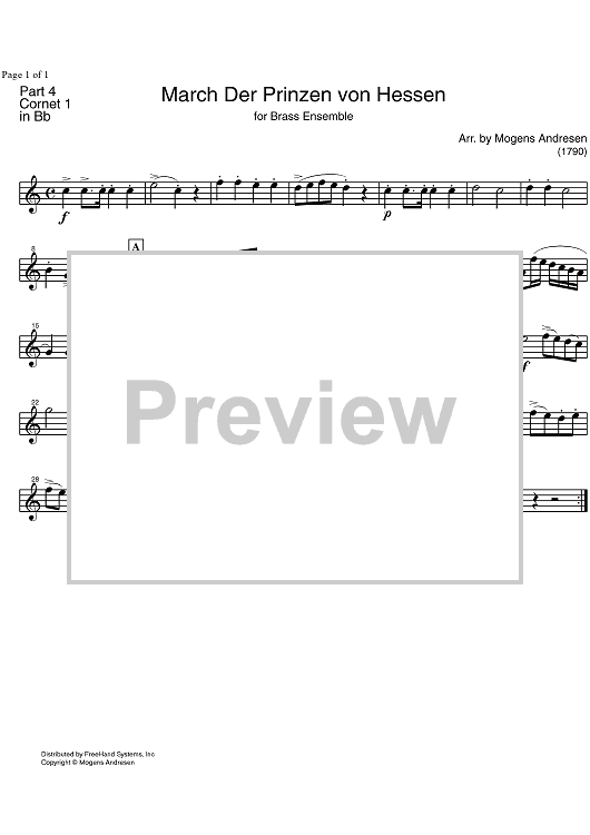 Digital Sheet Music for March Der Prinzen von Hessen - B-flat Cornet 1 by Unknown Writer, Mogens Andresen scored for Brass Ensemble; id:328300