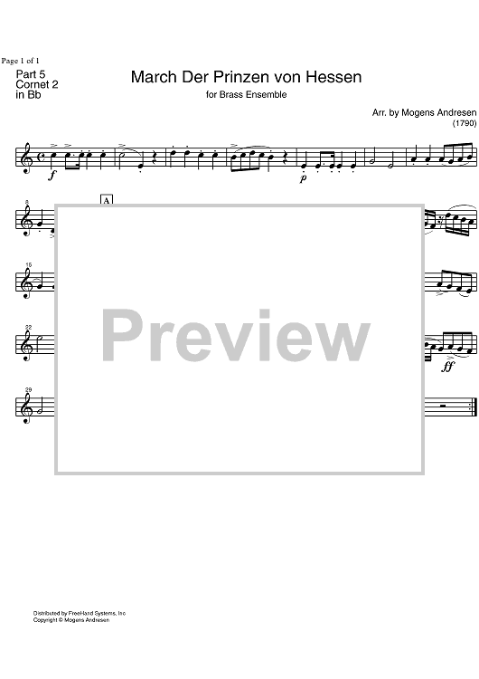 Digital Sheet Music for March Der Prinzen von Hessen - B-flat Cornet 2 by Unknown Writer, Mogens Andresen scored for Brass Ensemble; id:328301