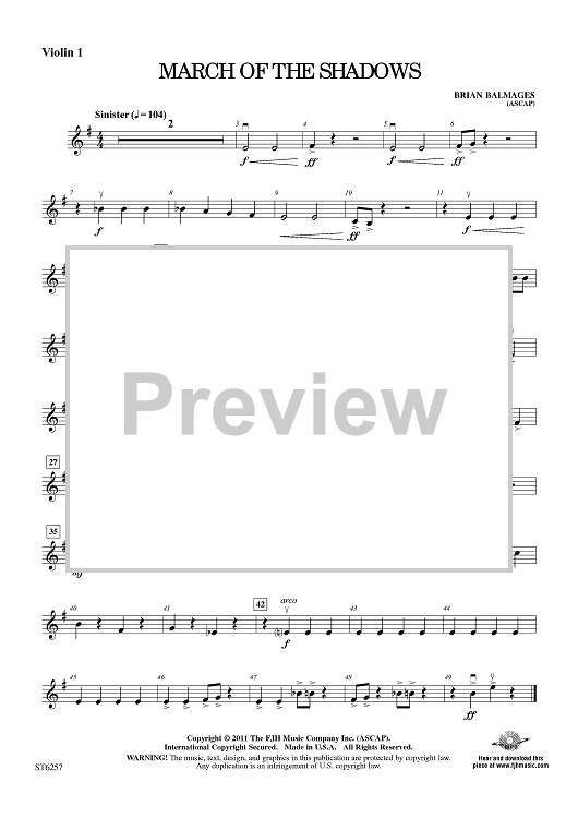 Digital Sheet Music for March of the Shadows - Violin 1 by Brian Balmages scored for String Orchestra; id:421750