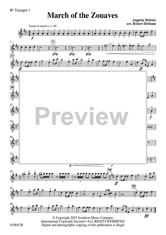 Digital Sheet Music for March of the Zouaves - Bb Trumpet 1 by Augusta Holmès, Robert Debbaut scored for Symphonic Band; id:507947