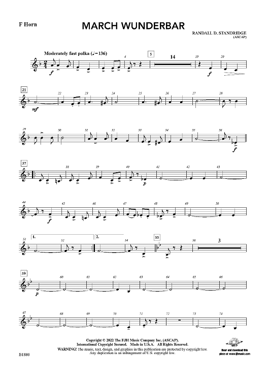 "March Wunderbar - F Horn" Sheet Music by Randall D. Standridge