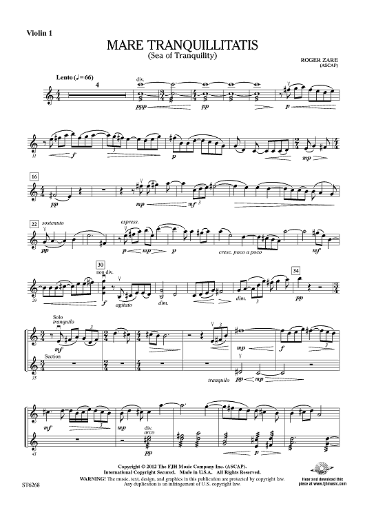 "Mare Tranquillitatis (Sea Of Tranquility) - Violin 1" Sheet Music by Roger Zare