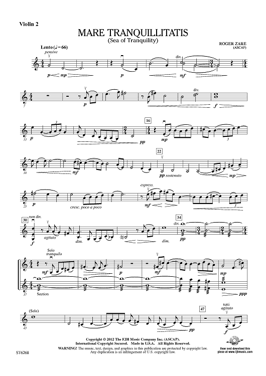"Mare Tranquillitatis (Sea Of Tranquility) - Violin 2" Sheet Music by Roger Zare