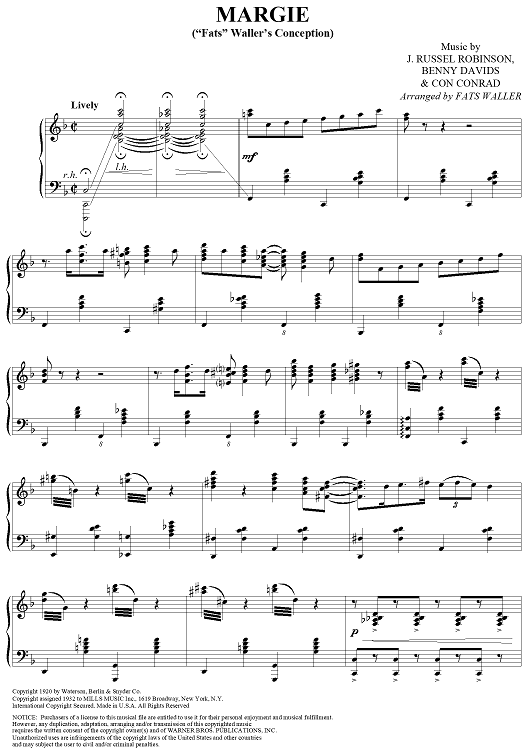 Digital Sheet Music for Margie ("Fats Waller's Conception) by Fats Waller, J. Russel Robinson, Benny Davis, Con Conrad scored for Piano Solo; id:317020