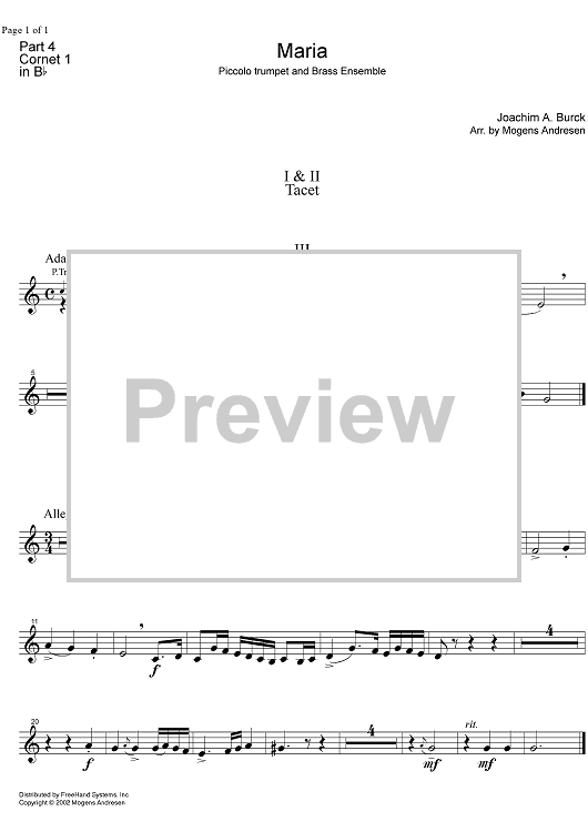 Digital Sheet Music for Maria - B-flat Cornet 1 by Mogens Andresen, Joachim Burck scored for Piccolo Trumpet/Brass Ensemble; id:331420