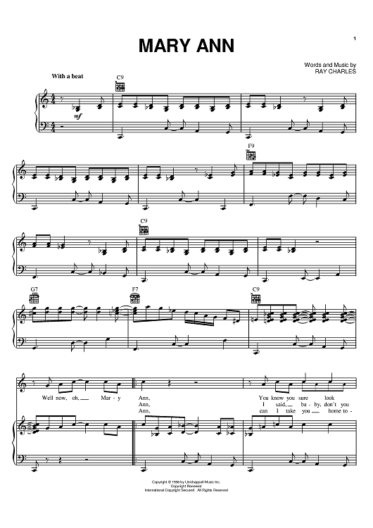 Digital Sheet Music for Mary Ann by Ray Charles scored for Piano/Vocal/Chords; id:384807