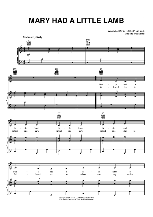 Digital Sheet Music for Mary Had A Little Lamb by Traditional, Sarah Josepha Hale scored for Piano/Vocal/Chords; id:368490