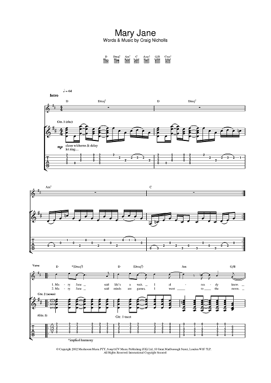 Digital Sheet Music for Mary Jane by The Vines scored for Guitar Tab; id:377662