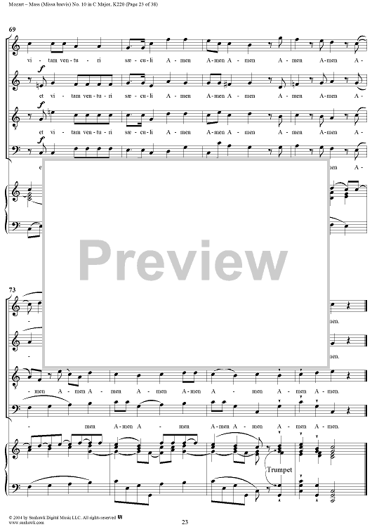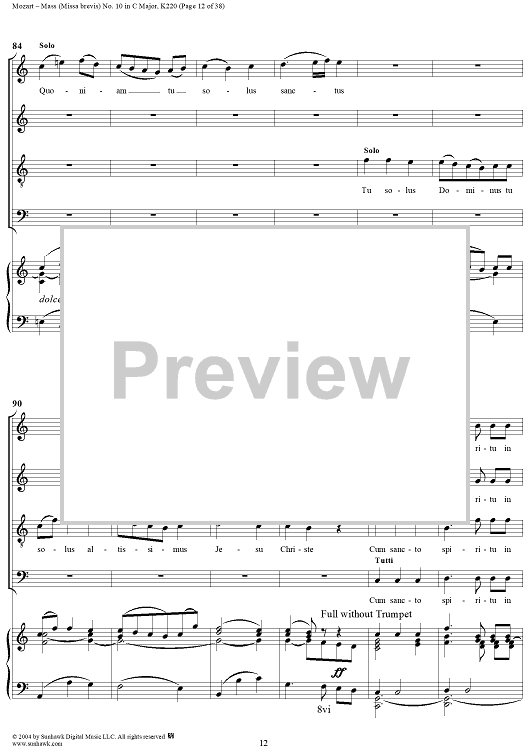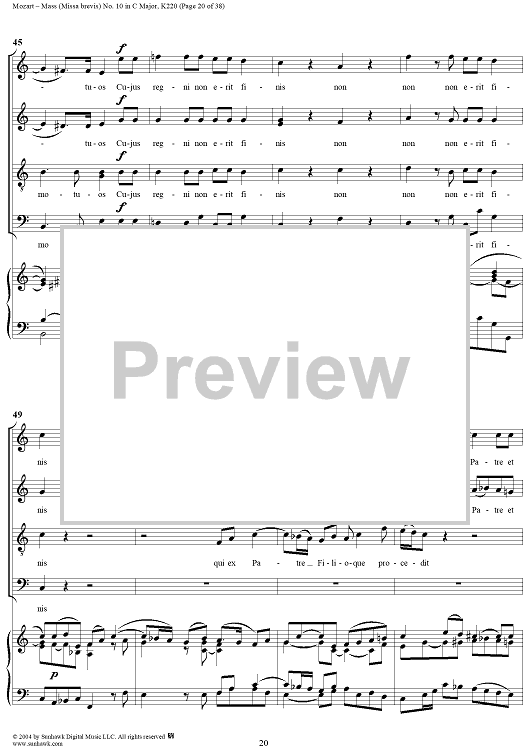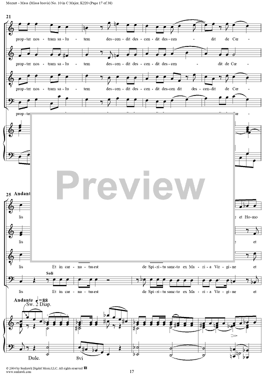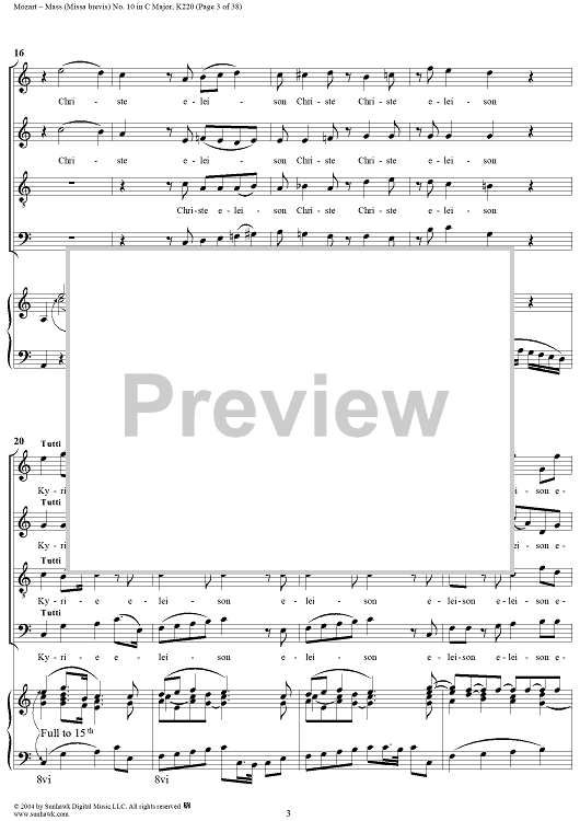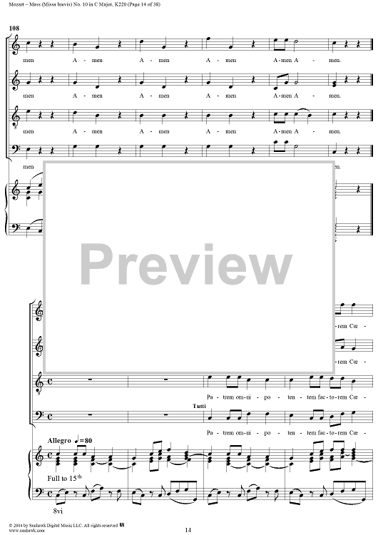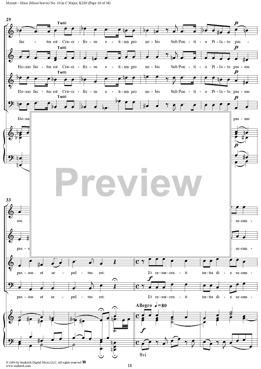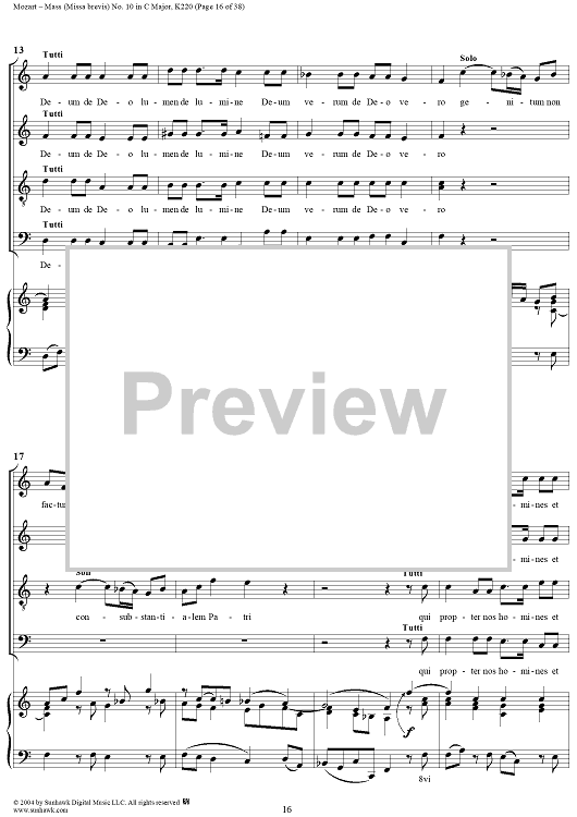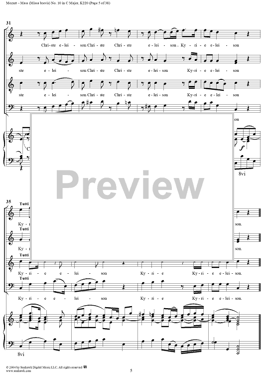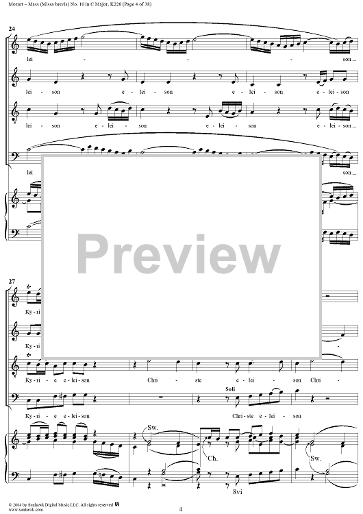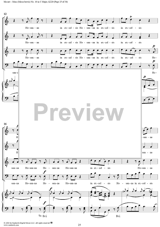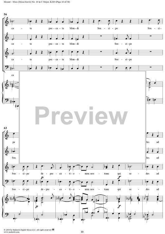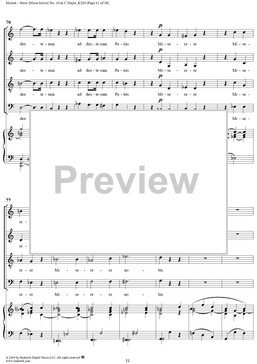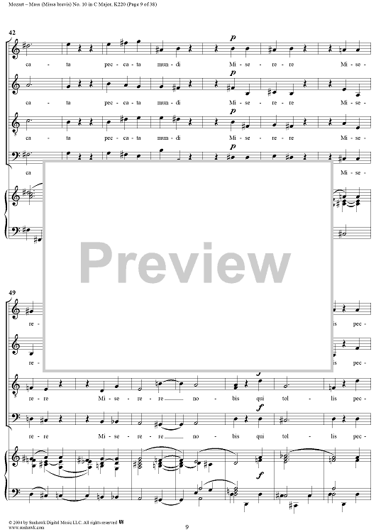 Digital Sheet Music for Mass (Missa brevis) No. 10 in C Major, K220 by Wolfgang Amadeus Mozart scored for Four-part Mixed Chorus/Piano; id:303387