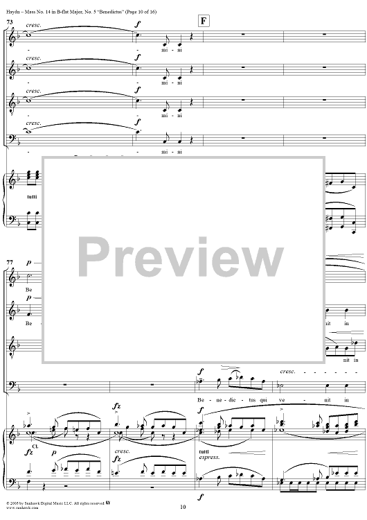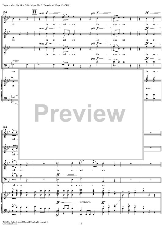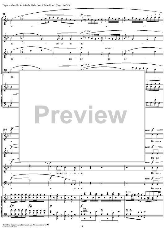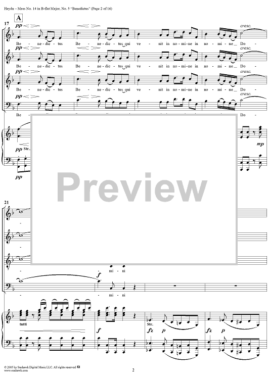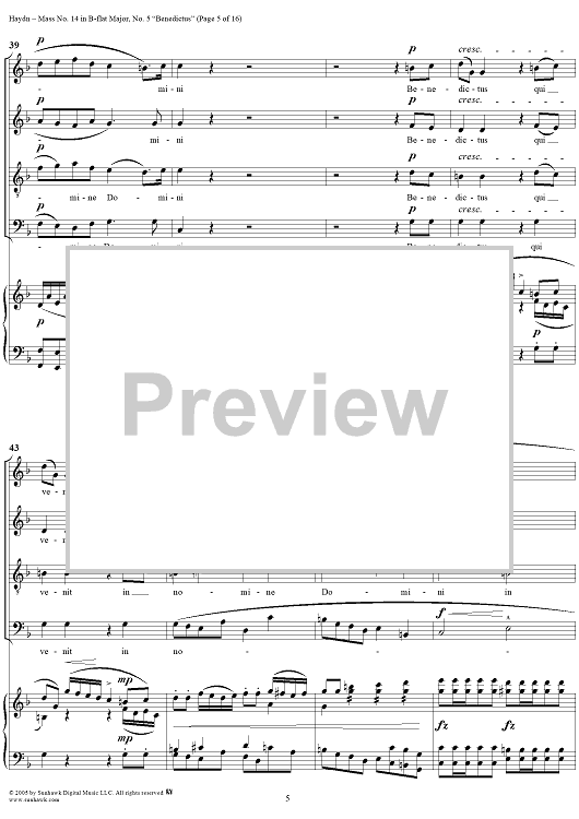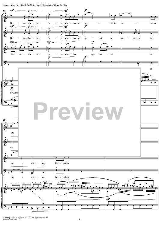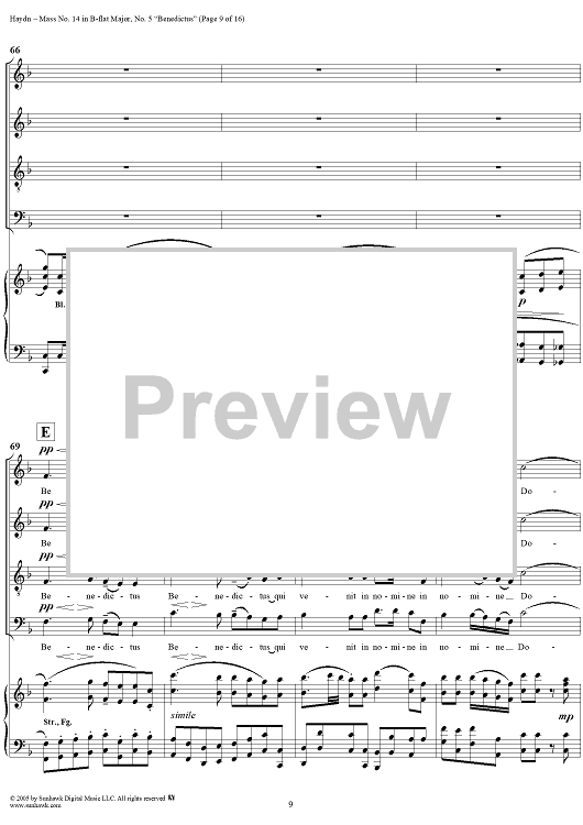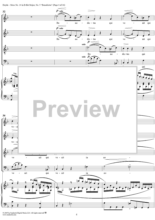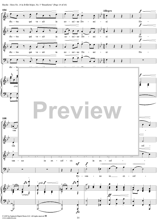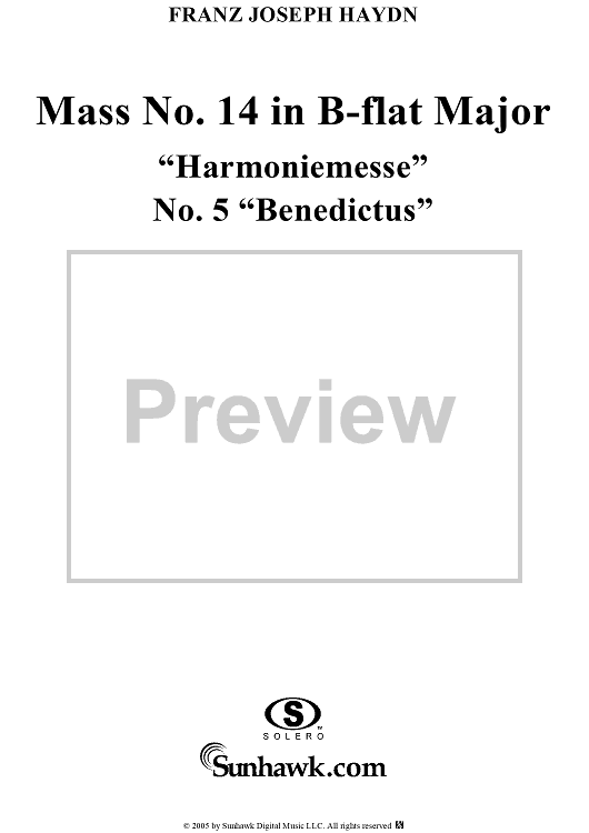 Digital Sheet Music for Mass No. 14 in B-flat Major, "Harmoniemesse"/"Wind Band Mass": No. 5. Benedictus by Franz Joseph Haydn scored for Four-part Mixed Chorus/Piano; id:306855