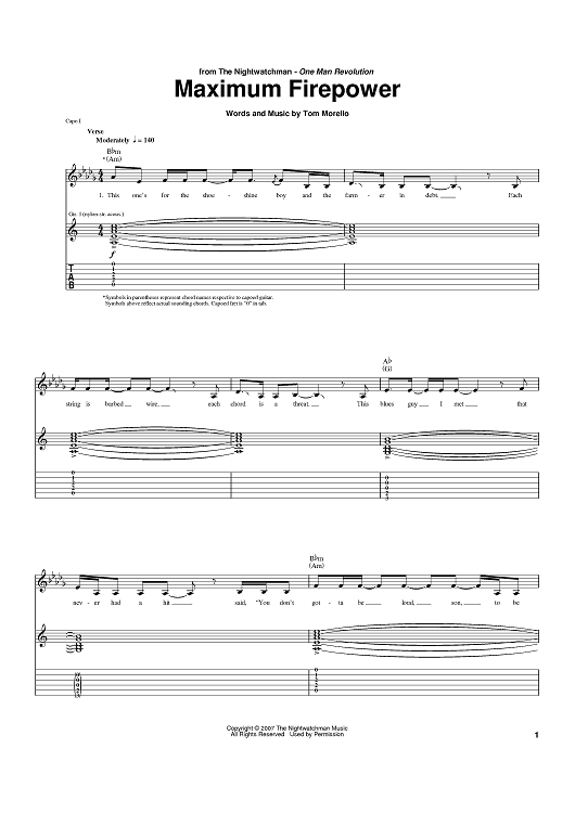 Digital Sheet Music for Maximum Firepower by Tom Morello, The Nightwatchman scored for Guitar Tab; id:401124