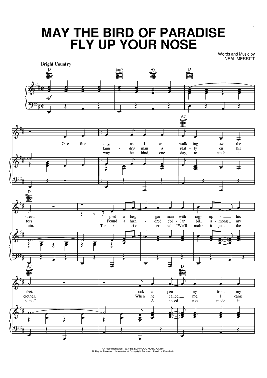 Digital Sheet Music for May The Bird Of Paradise Fly Up Your Nose by Little Jimmy Dickens, Neal Merritt scored for Piano/Vocal/Chords; id:388305