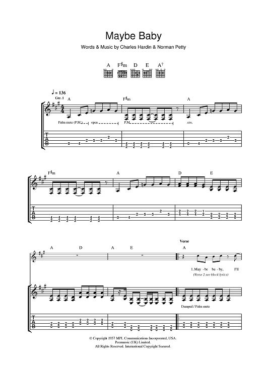 Digital Sheet Music for Maybe Baby by Norman Petty, Charles Hardin, Buddy Holly scored for Guitar Tab; id:401361