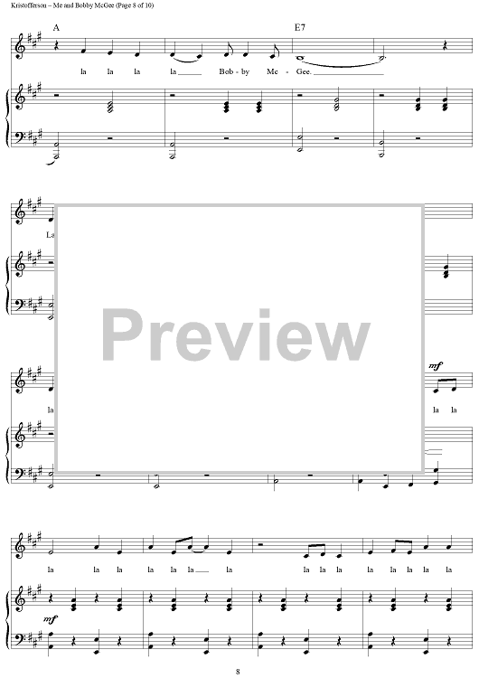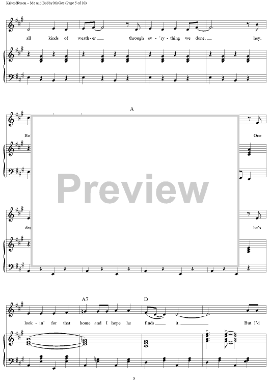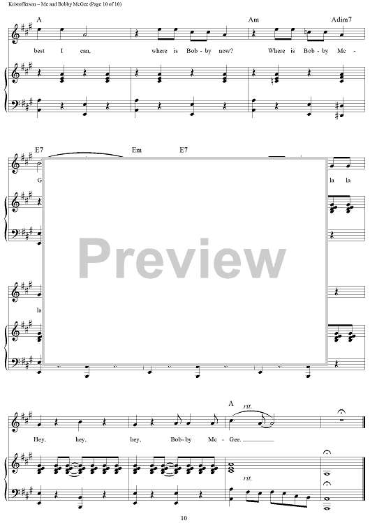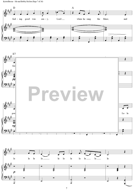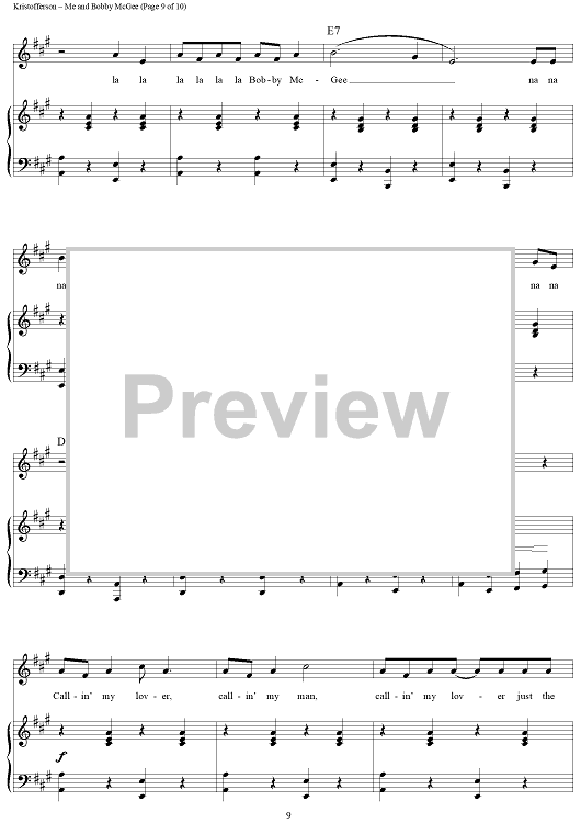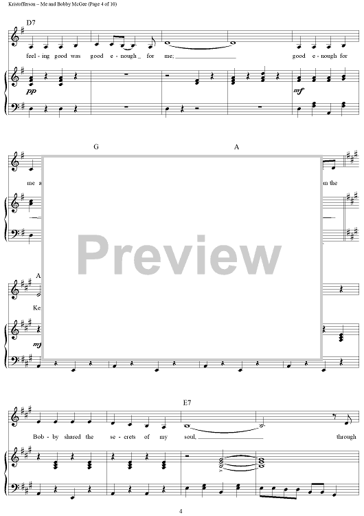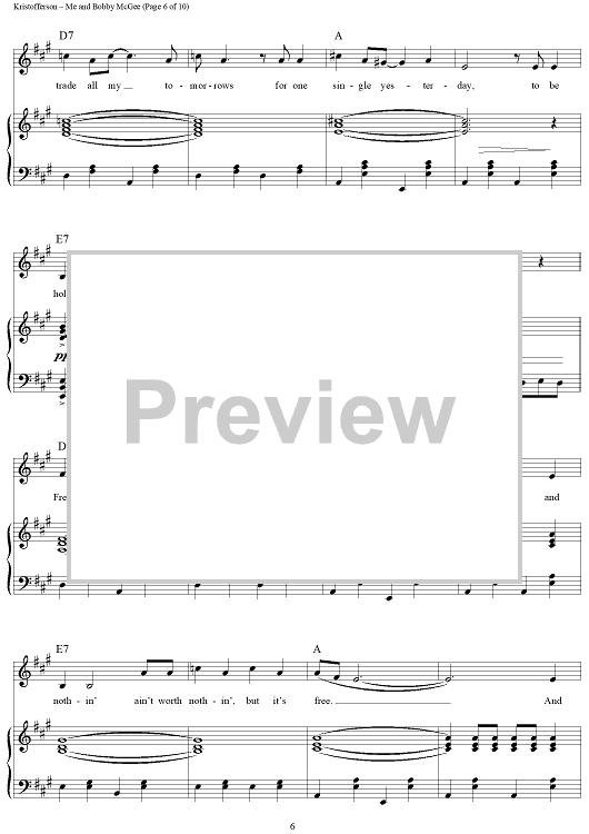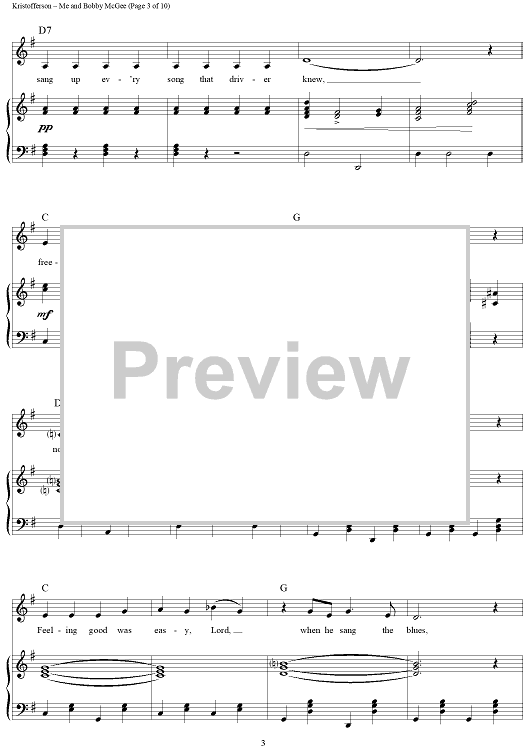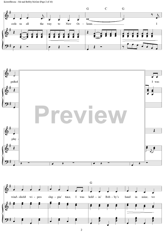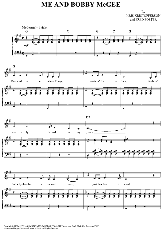 Digital Sheet Music for Me and Bobby McGee by Janis Joplin, Kris Kristofferson, Fred Foster scored for Piano/Vocal/Chords; id:362974