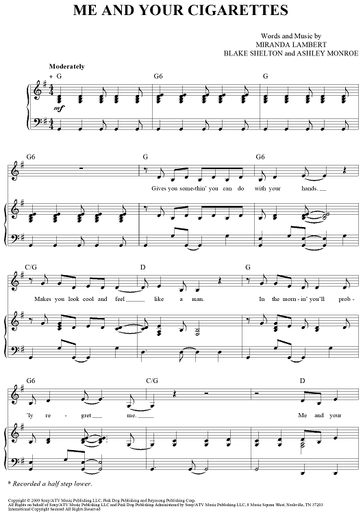 Digital Sheet Music for Me and Your Cigarettes by Blake Shelton, Miranda Lambert, Ashley Monroe scored for Piano/Vocal/Chords; id:442968