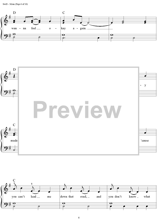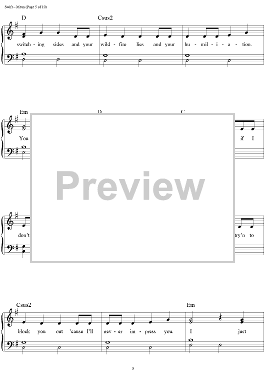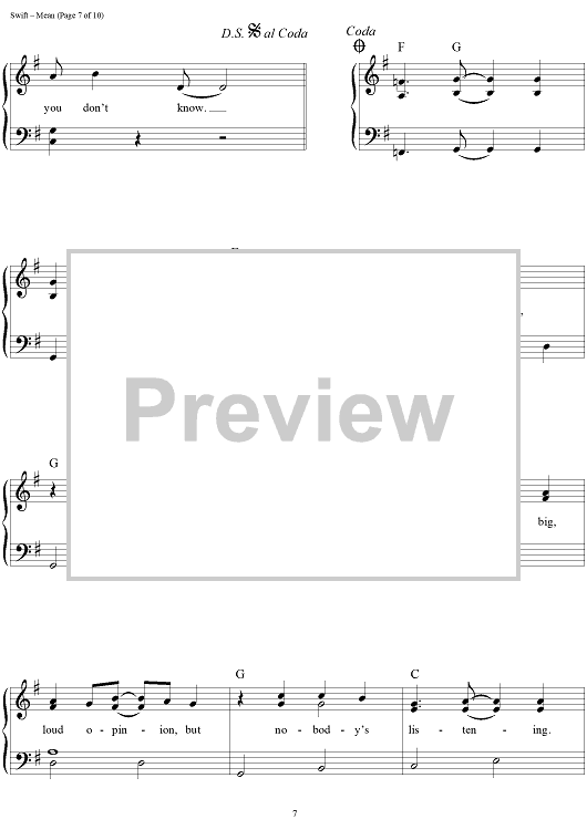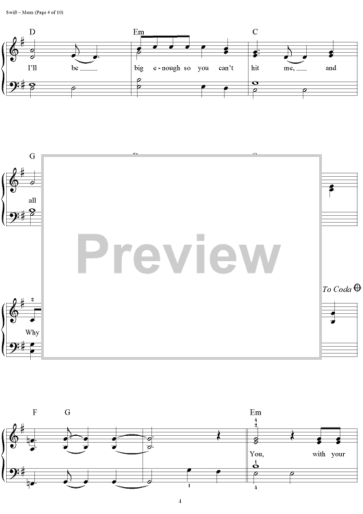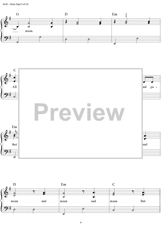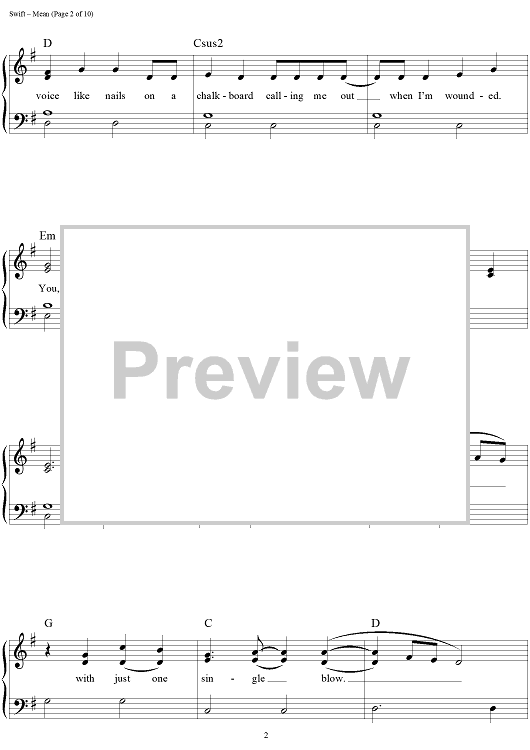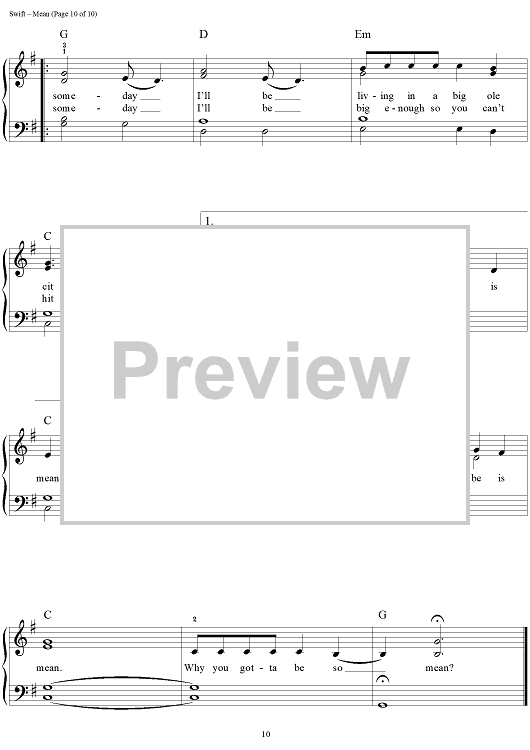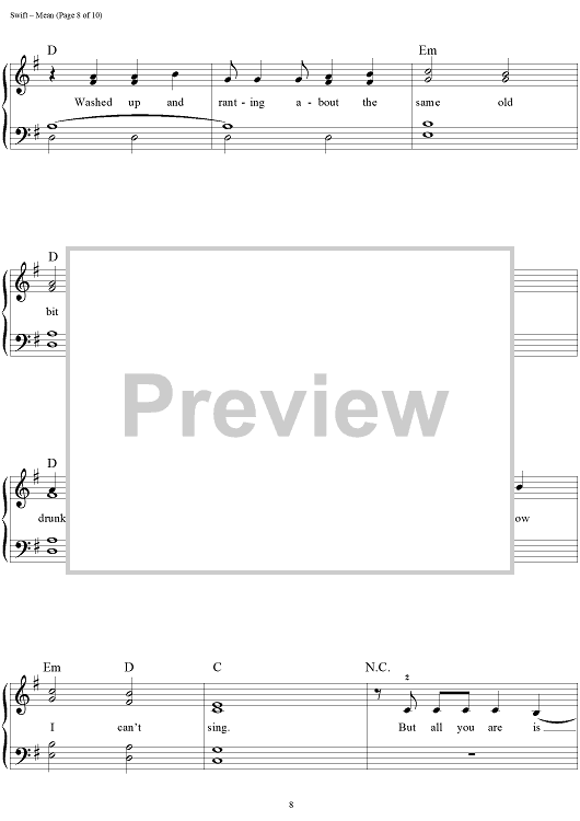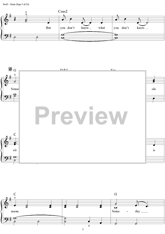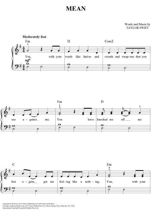 Digital Sheet Music for Mean by Taylor Swift scored for Easy Piano/Vocal/Chords; id:457227