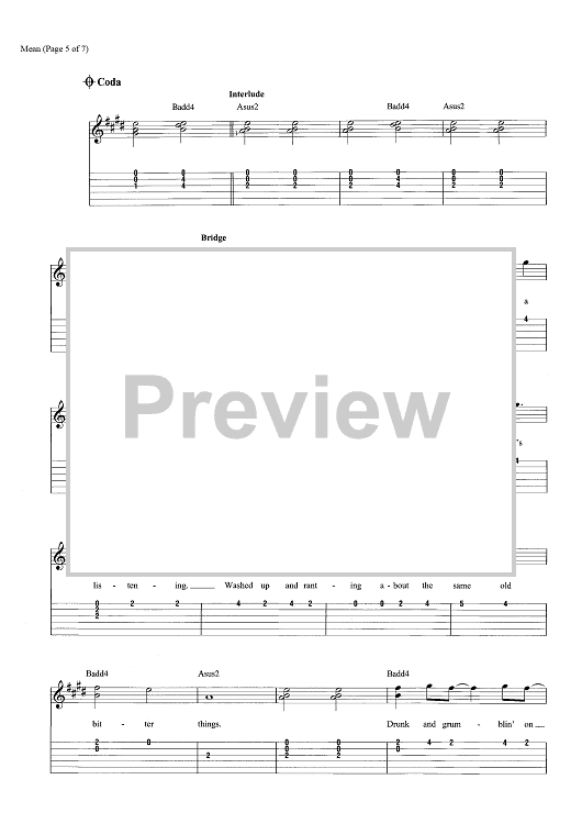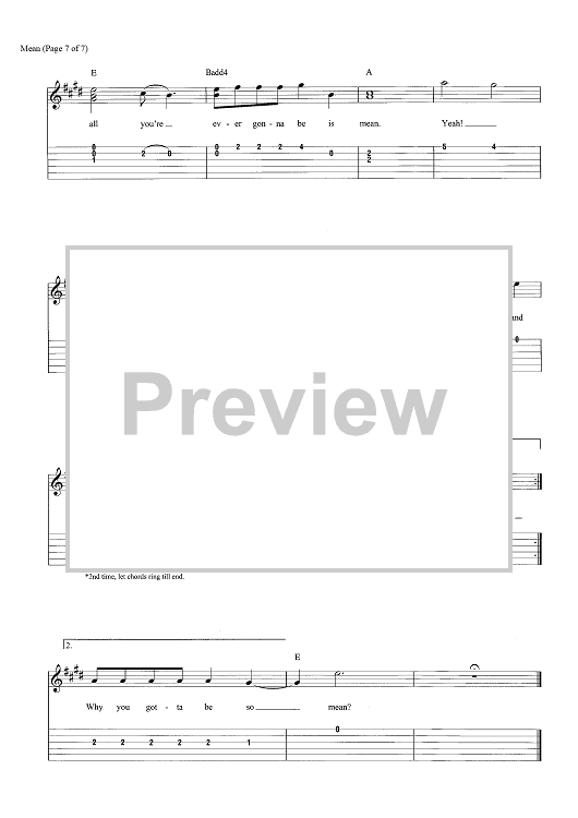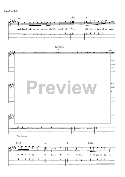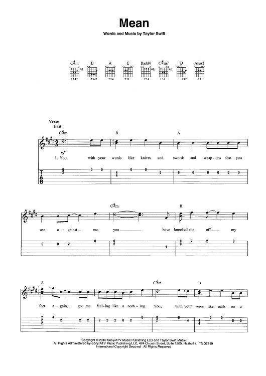 Digital Sheet Music for Mean by Taylor Swift scored for Easy Guitar Tab/Vocal; id:466117