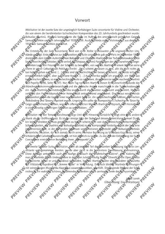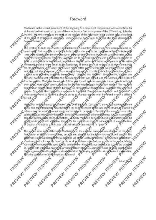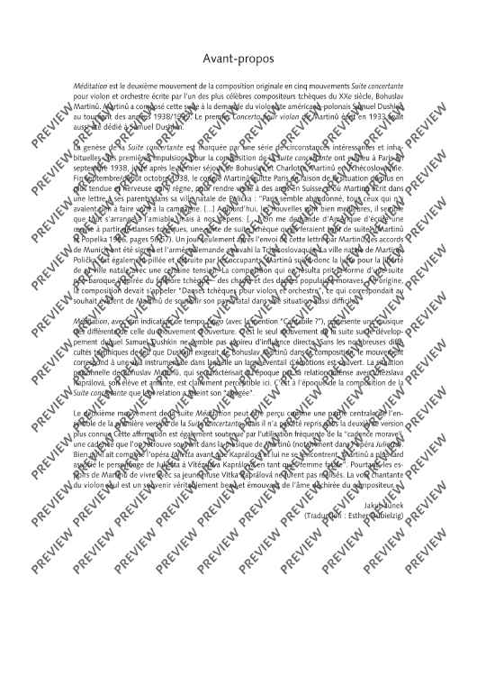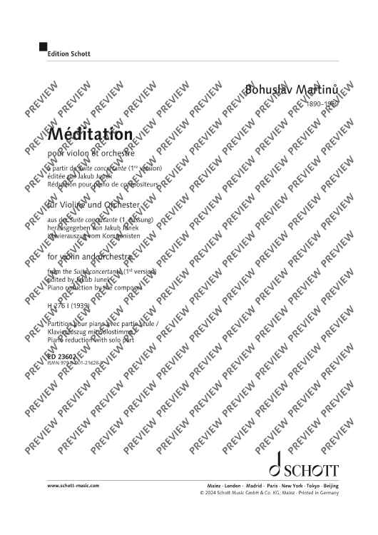 Méditation is the second movement of the Suite concertante for violin and orchestra. In this stand-alone instrumental "Aria", Martinu depicts a broad spectrum of emotions. This edition was published for the first time after the early version of the suite.