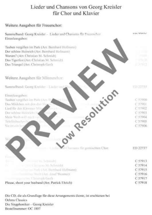 Georg Kreisler – das ist scharfer, tiefsinnig schwarzer Humor! Die Singphoniker haben Georg Kreislers bekannteste Lieder für Männerensemble arrangiert und auf CD aufgenommen. Die zugehörige Notenausgabe für Frauenchor SSAA mit Klavierbegleitung ist bei Schott Music erschienen (Georg Kreisler - Lieder und Chansons, ED 22736). Ergänzend dazu sind Einzelausgaben aller Lieder aus dem Notenalbum erhältlich: Mein Mann will mich verlassen – „Gott sei Dank!“ Der Auszug des Ehemanns kann in Mein Mann will mich verlassen gar nicht schnell genug gehen. Als der Gatte dann endlich aus der Tür raus ist, war doch alles nur ein Traum. „Oi weh!“ Dieses kurzweilige Arrangement mit Kreislers humoristischem Text sorgt im Konzert garantiert für ausgelassene Stimmung.